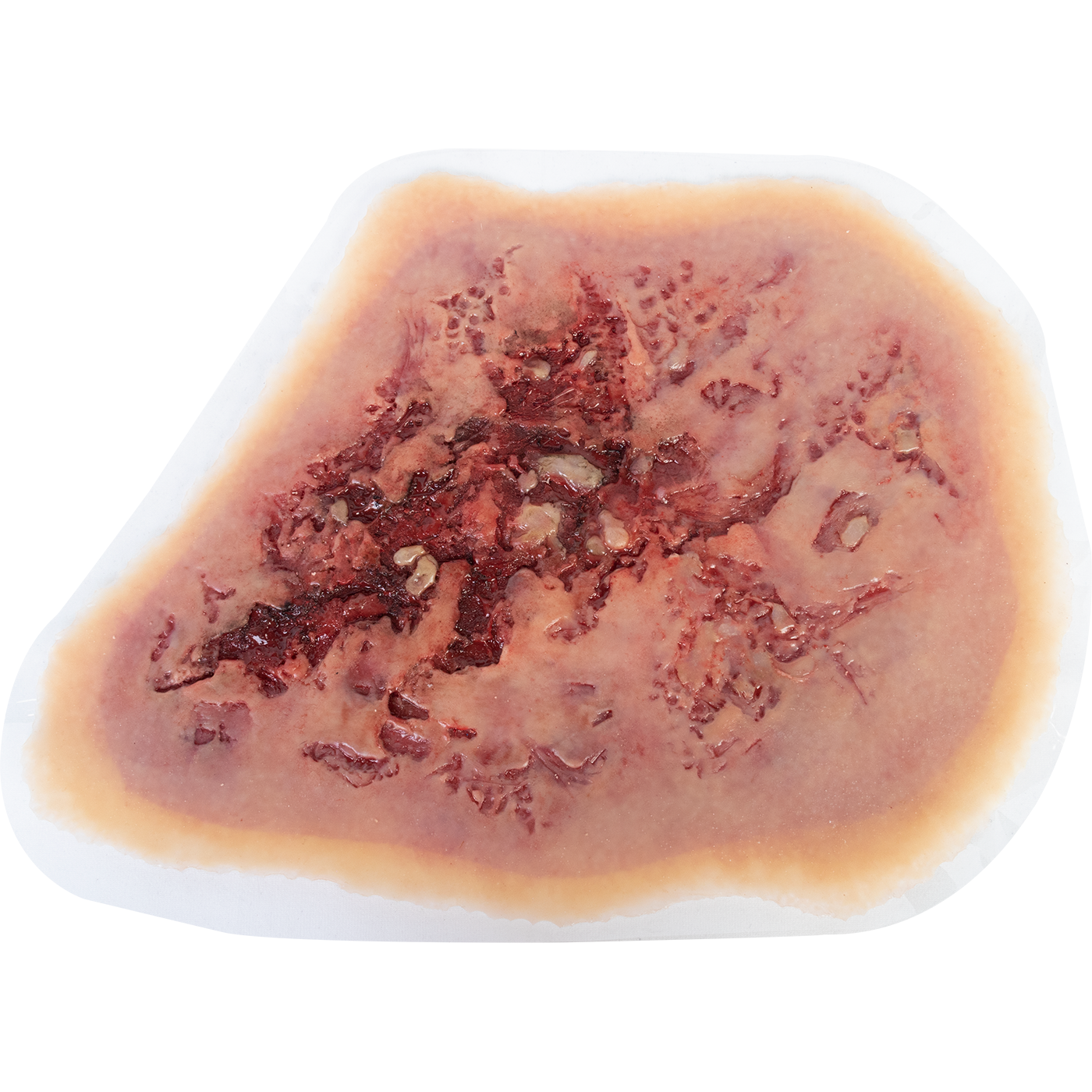 The representative skin and tissue of the adhesive wounds is constructed of high-quality silicone rubber, with layers of coloration that provide a depth and realism to the product. In addition, the SOFTTECH® material has a realistic feel, and is very durable and UV resistant. The skin also contains a reinforcing fabric that provides strength, and resistance to tear propagation should the skin be punctured or cut.